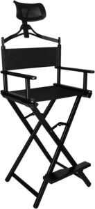 Come anticipato, l’altezza è un aspetto cruciale. La sedia dev’essere alta, più della classica sedia da regista, perché il truccatore deve poter lavorare con la schiena eretta. Inoltre, la possibilità di regolare la seduta a diverse altezze (doppia altezza) consente di adattarsi alle differenti stature dei clienti.